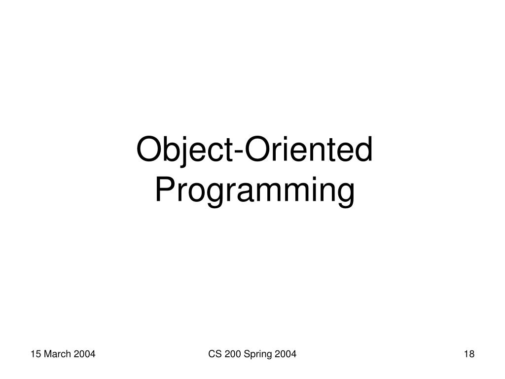 Objects • When we package state and procedures together we have an object • Programming with objects is object-oriented programming CS 200 Spring 2004