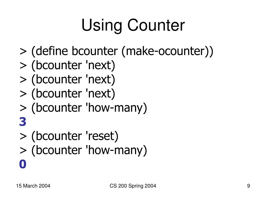 Using Counter > (define bcounter (make-ocounter)) > (bcounter 'next) > (bcounter 'next) > (bcounter 'next) > (bcounter 'how-many) 3 > (bcounter 'reset) > (bcounter 'how-many) 0 CS 200 Spring 2004