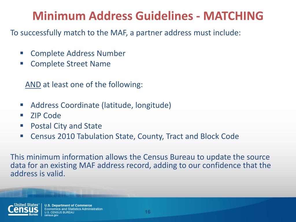 Minimum Address Guidelines - MATCHING To successfully match to the MAF, a partner address must include: • Complete Address Number • Complete Street Name AND at least one of the following: • Address Coordinate (latitude, longitude) • ZIP Code • Postal City and State • Census 2010 Tabulation State, County, Tract and Block Code This minimum information allows the Census Bureau to update the source data for an existing MAF address record, adding to our confidence that the address is valid.