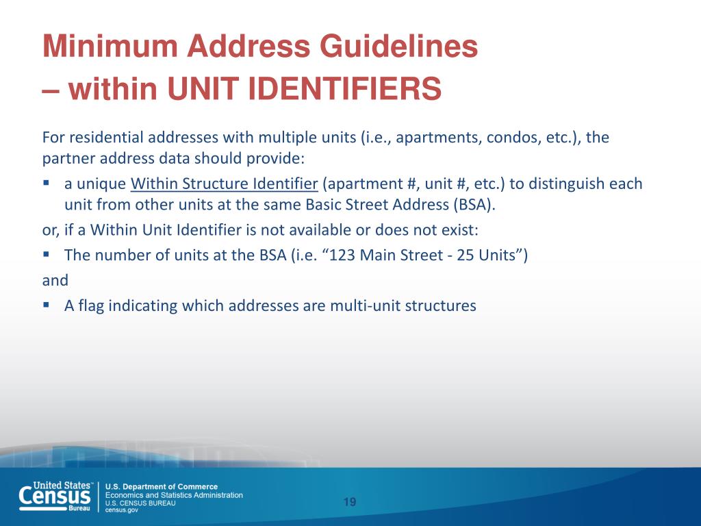 Minimum Address Guidelines – within UNIT IDENTIFIERS For residential addresses with multiple units (i.e., apartments, condos, etc.), the partner address data should provide: • a unique Within Structure Identifier(apartment #, unit #, etc.) to distinguish each unit from other units at the same Basic Street Address (BSA). or, if a Within Unit Identifier is not available or does not exist: • The number of units at the BSA (i.e. “123 Main Street - 25 Units”) and • A flag indicating which addresses are multi-unit structures