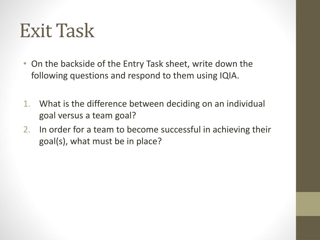 Exit Task • On the backside of the Entry Task sheet, write down the following questions and respond to them using IQIA. • What is the difference between deciding on an individual goal versus a team goal? • In order for a team to become successful in achieving their goal(s), what must be in place?
