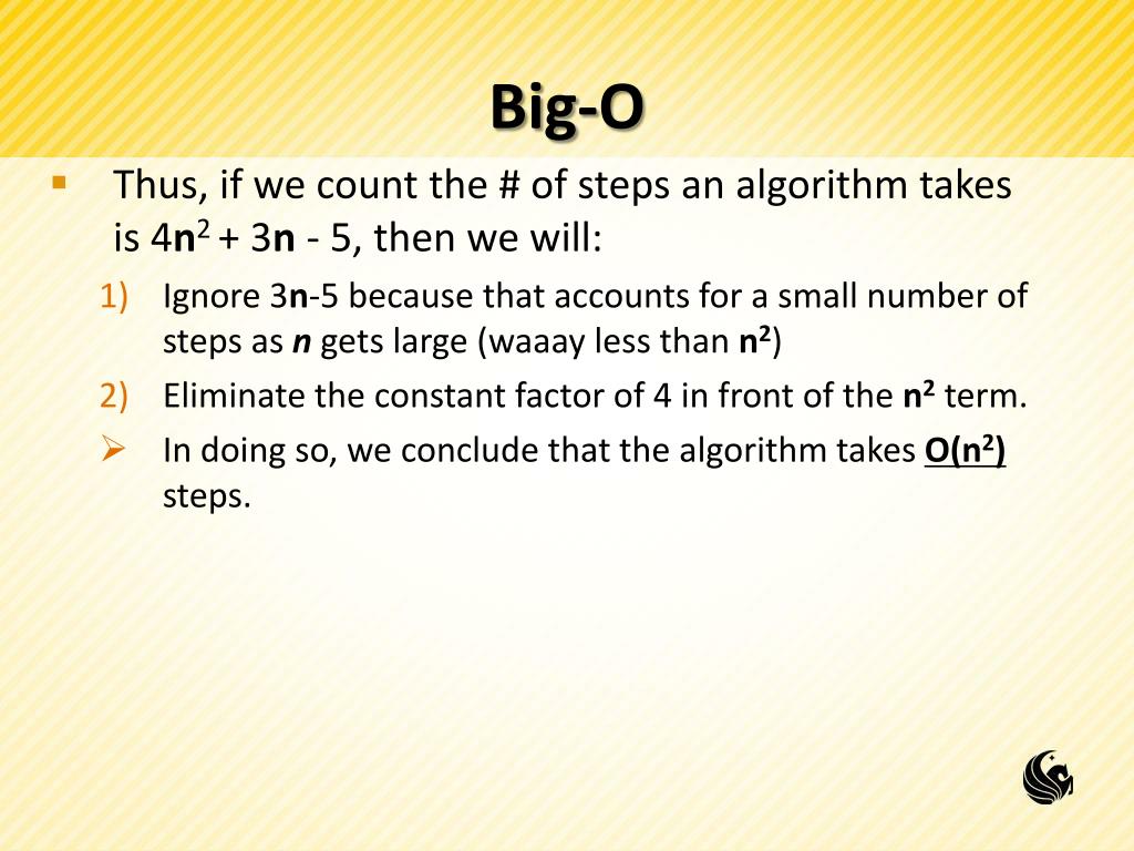 Big-O • Thus, if we count the # of steps an algorithm takes is 4n2 + 3n - 5, then we will: • Ignore 3n-5 because that accounts for a small number of steps as n gets large (waaay less than n2) • Eliminate the constant factor of 4 in front of the n2 term. • In doing so, we conclude that the algorithm takes O(n2) steps.