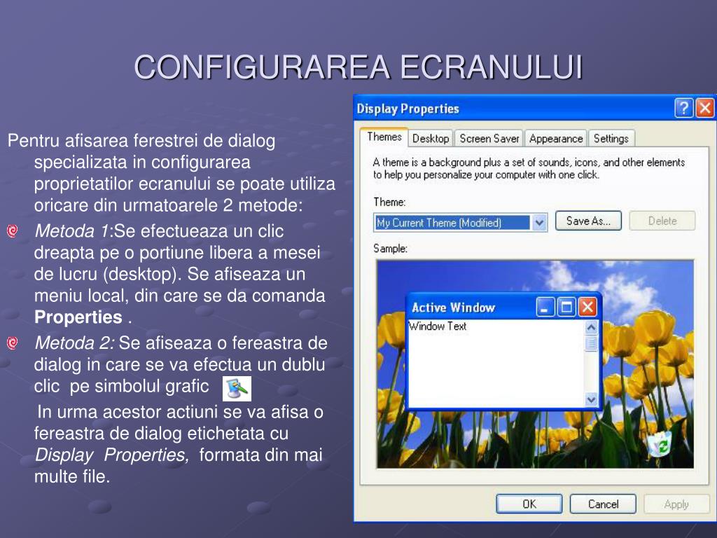 CONFIGURAREA ECRANULUI Pentru afisarea ferestrei de dialog specializata in configurarea proprietatilor ecranului se poate utiliza oricare din urmatoarele 2 metode: • Metoda 1:Se efectueaza un clic dreapta pe o portiune libera a mesei de lucru (desktop). Se afiseaza un meniu local, din care se da comanda Properties . • Metoda 2: Se afiseaza o fereastra de dialog in care se va efectua un dublu clic pe simbolul grafic In urma acestor actiuni se va afisa o fereastra de dialog etichetata cu Display Properties, formata din mai multe file.