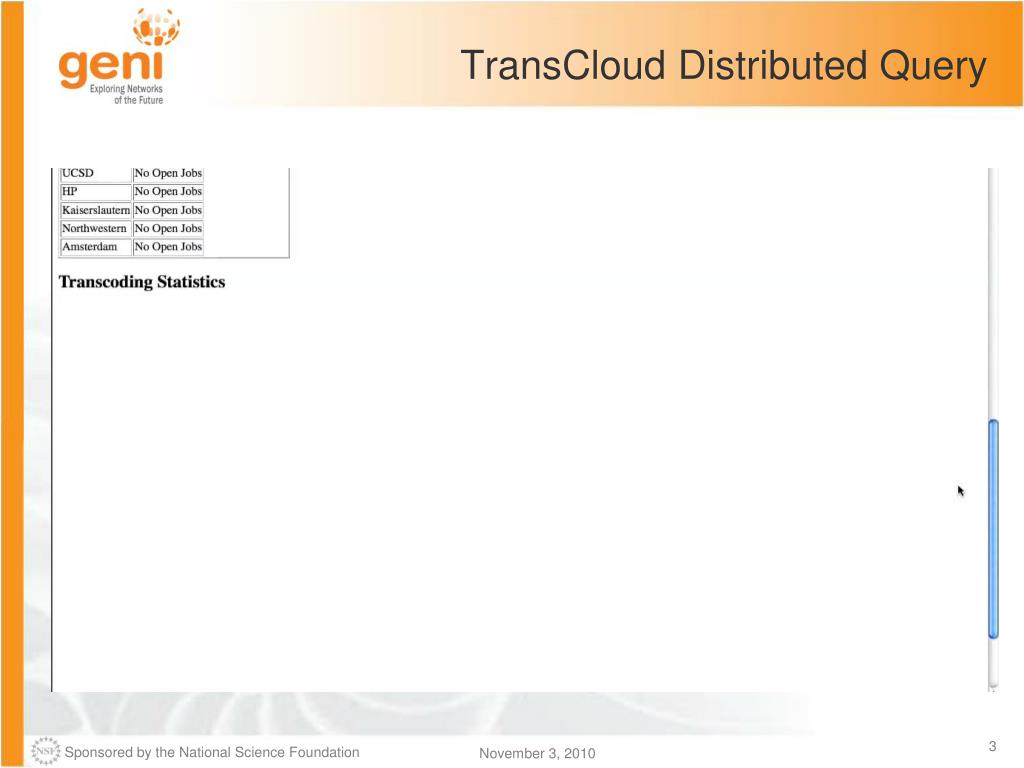 TransCloud Today Sites at HP Labs, Palo Alto UC San Diego Northwestern Kaiserslautern Coming soon Amsterdam Connectivity provided by: CAVEWave, StarLight, NetherLight, DFN, National Lambda Rail, Global Lambda Integrated Facility