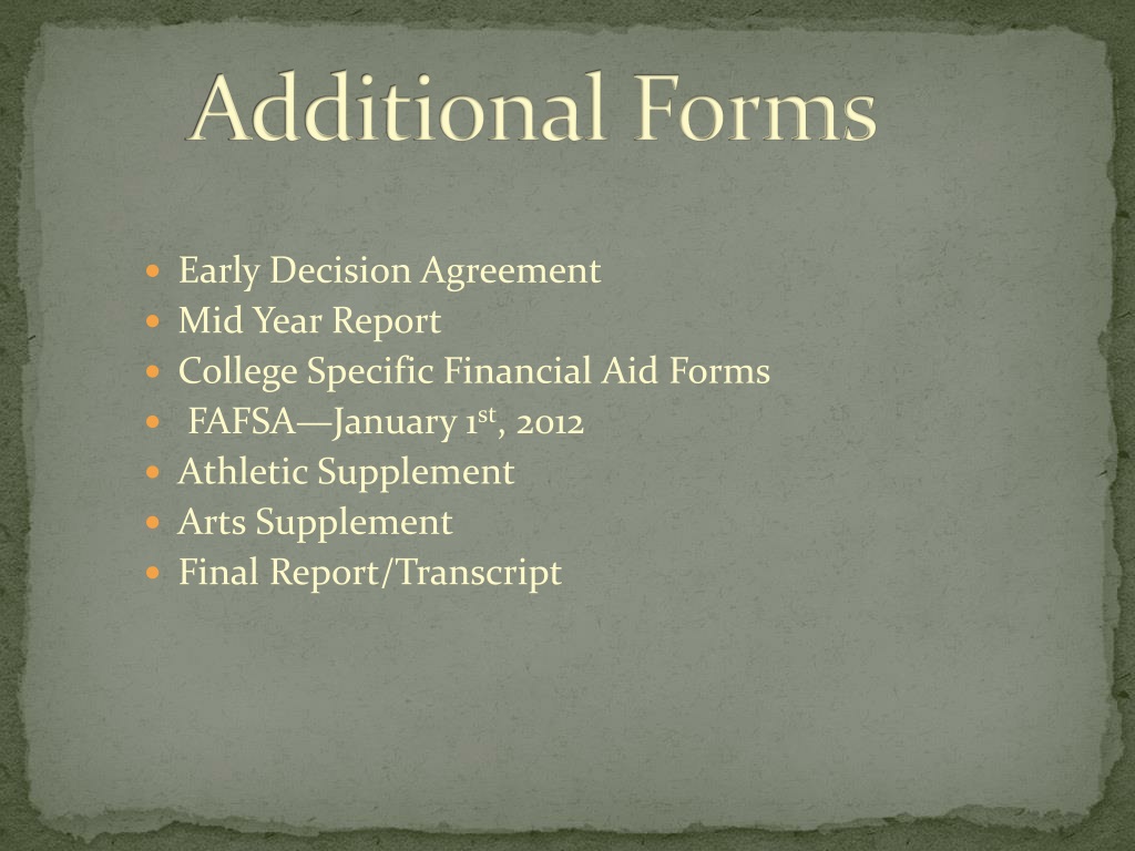 Additional Forms • Early Decision Agreement • Mid Year Report • College Specific Financial Aid Forms • FAFSA—January 1st, 2012 • Athletic Supplement • Arts Supplement • Final Report/Transcript