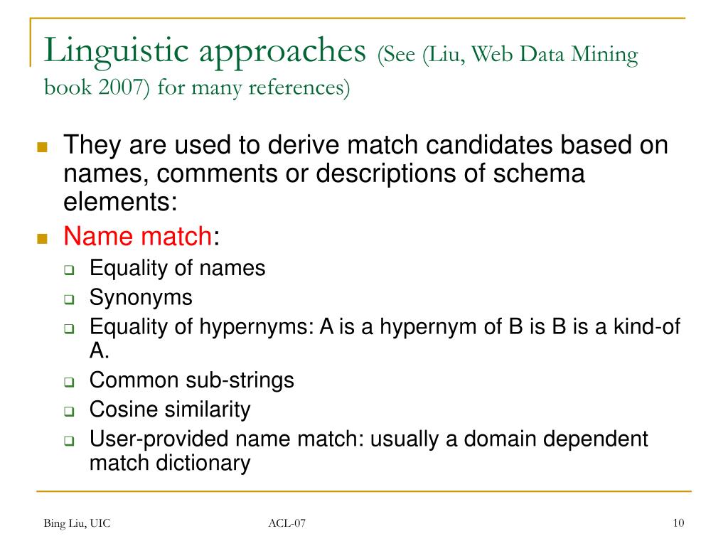 Linguistic approaches (See (Liu, Web Data Mining book 2007) for many references) • They are used to derive match candidates based on names, comments or descriptions of schema elements: • Name match: • Equality of names • Synonyms • Equality of hypernyms: A is a hypernym of B is B is a kind-of A. • Common sub-strings • Cosine similarity • User-provided name match: usually a domain dependent match dictionary Bing Liu, UIC ACL-07