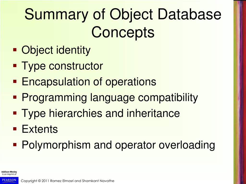 Summary of Object Database Concepts • Object identity • Type constructor • Encapsulation of operations • Programming language compatibility • Type hierarchies and inheritance • Extents • Polymorphism and operator overloading