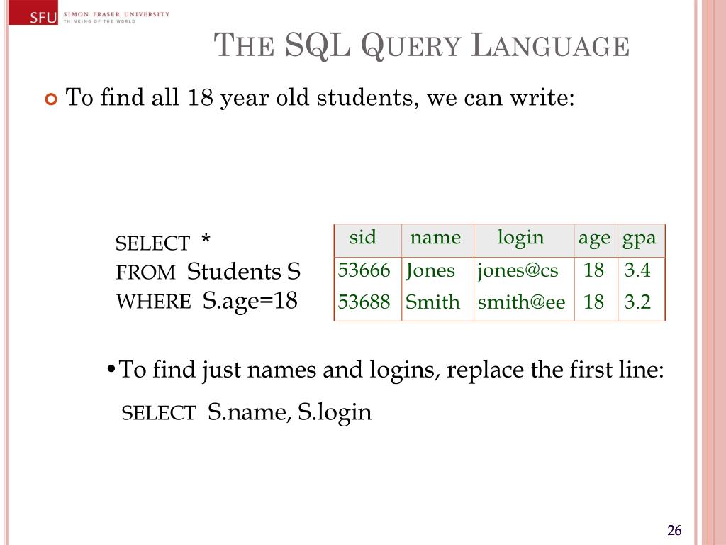 The SQL Query Language • To find all 18 year old students, we can write: SELECT * FROM Students S WHERE S.age=18 • To find just names and logins, replace the first line: SELECT S.name, S.login