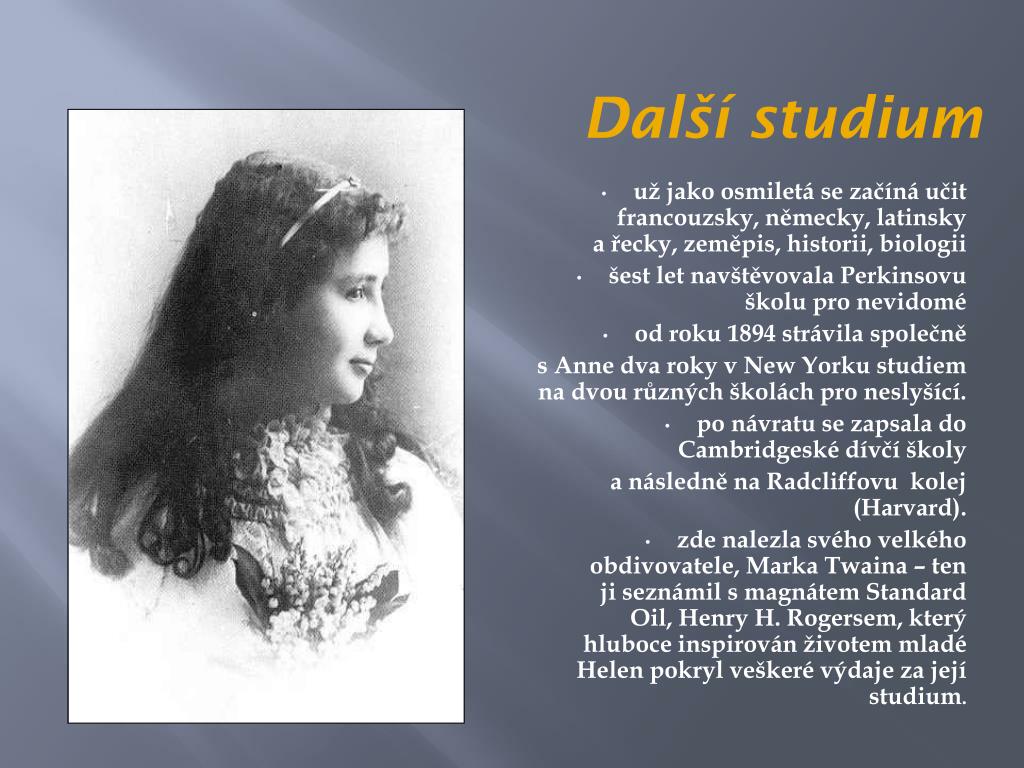 … a kromě studia dopisuje si se spisovateli, básníky, duchovními … organizuje finanční sbírku, aby školu pro nevidomé mohl navštěvovat i chudý chlapec Tommy se svou učitelkou podniká daleké i blízké cesty (Niagarské vodopády, světová výstava …) píše svou první povídku a je obviněna z plagiátorství !!! jako terapii po prožitém traumatickém „výslechu“ píše svůj životopis „The Story of My Life“