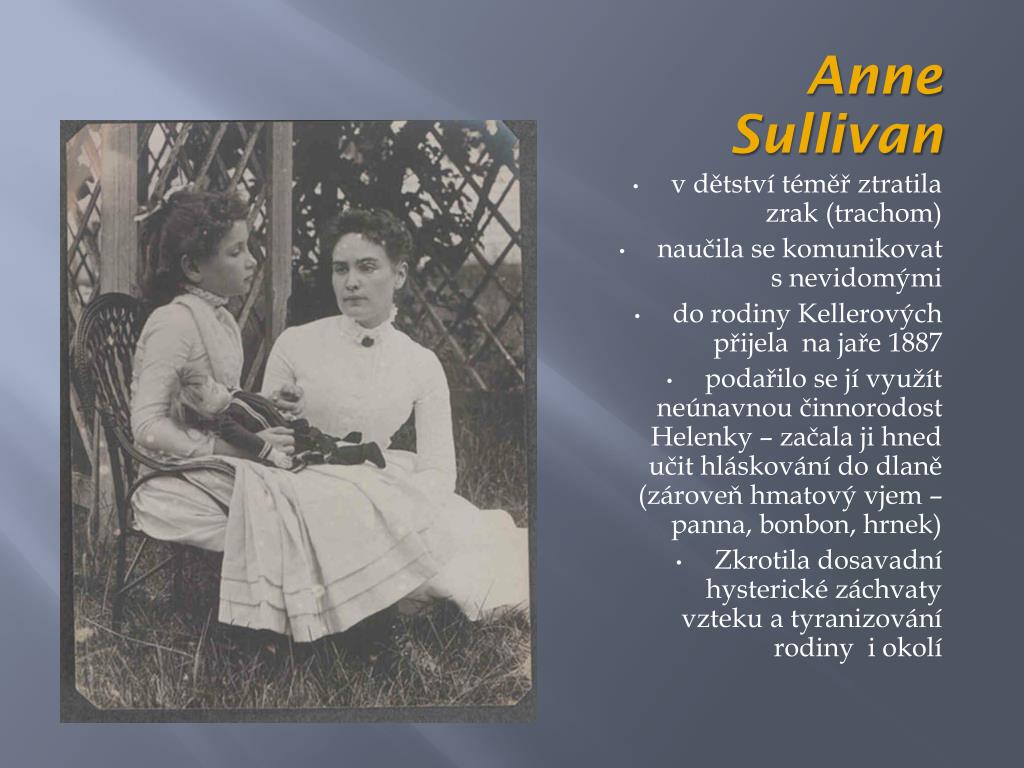 Anne Sullivan v dětství téměř ztratila zrak (trachom) naučila se komunikovat s nevidomými do rodiny Kellerových přijela na jaře 1887 podařilo se jí využít neúnavnou činnorodost Helenky – začala ji hned učit hláskování do dlaně (zároveň hmatový vjem – panna, bonbon, hrnek) Zkrotila dosavadní hysterické záchvaty vzteku a tyranizování rodiny i okolí