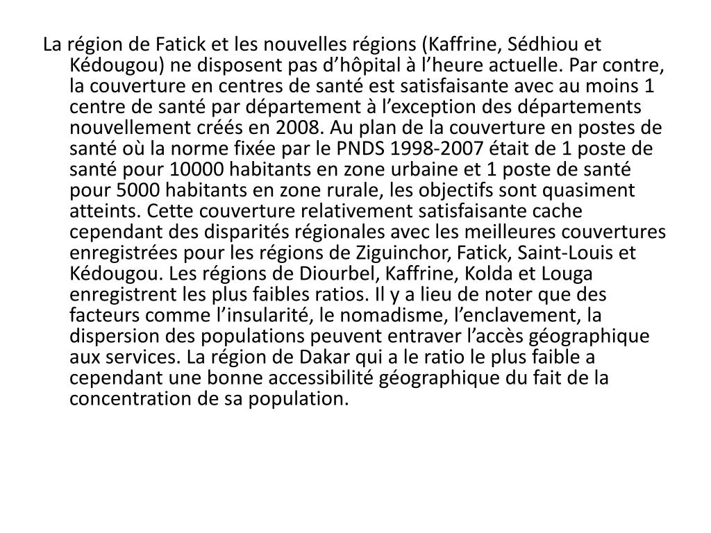 La région de Fatick et les nouvelles régions (Kaffrine, Sédhiou et Kédougou) ne disposent pas d’hôpital à l’heure actuelle. Par contre, la couverture en centres de santé est satisfaisante avec au moins 1 centre de santé par département à l’exception des départements nouvellement créés en 2008. Au plan de la couverture en postes de santé où la norme fixée par le PNDS 1998-2007 était de 1 poste de santé pour 10000 habitants en zone urbaine et 1 poste de santé pour 5000 habitants en zone rurale, les objectifs sont quasiment atteints. Cette couverture relativement satisfaisante cache cependant des disparités régionales avec les meilleures couvertures enregistrées pour les régions de Ziguinchor, Fatick, Saint-Louis et Kédougou. Les régions de Diourbel, Kaffrine, Kolda et Louga enregistrent les plus faibles ratios. Il y a lieu de noter que des facteurs comme l’insularité, le nomadisme, l’enclavement, la dispersion des populations peuvent entraver l’accès géographique aux services. La région de Dakar qui a le ratio le plus faible a cependant une bonne accessibilité géographique du fait de la concentration de sa population.