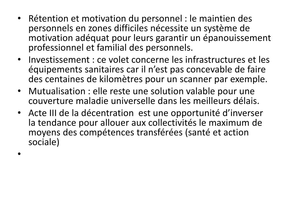 Rétention et motivation du personnel : le maintien des personnels en zones difficiles nécessite un système de motivation adéquat pour leurs garantir un épanouissement professionnel et familial des personnels. • Investissement : ce volet concerne les infrastructures et les équipements sanitaires car il n’est pas concevable de faire des centaines de kilomètres pour un scanner par exemple. • Mutualisation : elle reste une solution valable pour une couverture maladie universelle dans les meilleurs délais. • Acte III de la décentration est une opportunité d’inverser la tendance pour allouer aux collectivités le maximum de moyens des compétences transférées (santé et action sociale)
