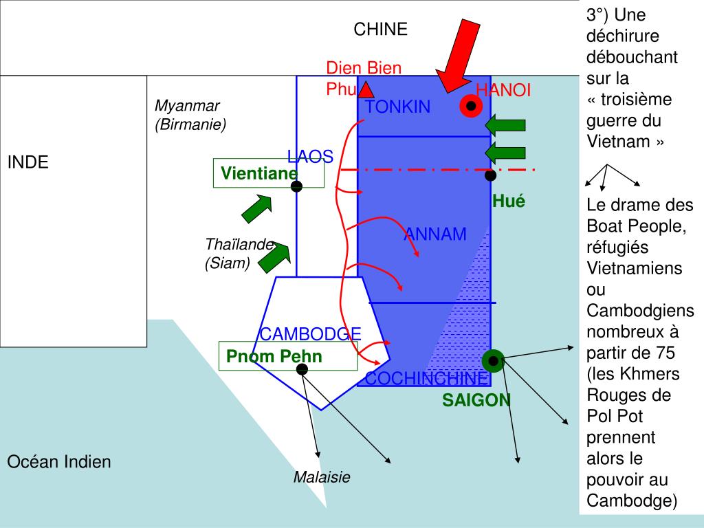 3°) Une déchirure débouchant sur la « troisième guerre du Vietnam » Le drame des Boat People, réfugiés Vietnamiens ou Cambodgiensnombreux à partir de 75 (les Khmers Rouges de Pol Pot prennent alors le pouvoir au Cambodge) CHINE Dien Bien Phu HANOI Myanmar (Birmanie) TONKIN LAOS INDE Vientiane Hué ANNAM Thaïlande (Siam) CAMBODGE Pnom Pehn COCHINCHINE SAIGON Océan Indien Malaisie