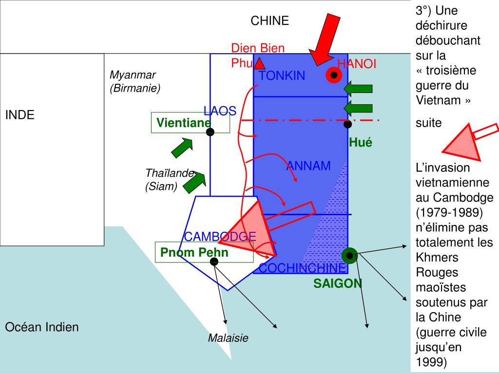 3°) Une déchirure débouchant sur la « troisième guerre du Vietnam » suite L’invasion vietnamienne au Cambodge (1979-1989) n’élimine pas totalement les Khmers Rouges maoïstes soutenus par la Chine (guerre civile jusqu’en 1999) CHINE Dien Bien Phu HANOI Myanmar (Birmanie) TONKIN LAOS INDE Vientiane Hué ANNAM Thaïlande (Siam) CAMBODGE Pnom Pehn COCHINCHINE SAIGON Océan Indien Malaisie