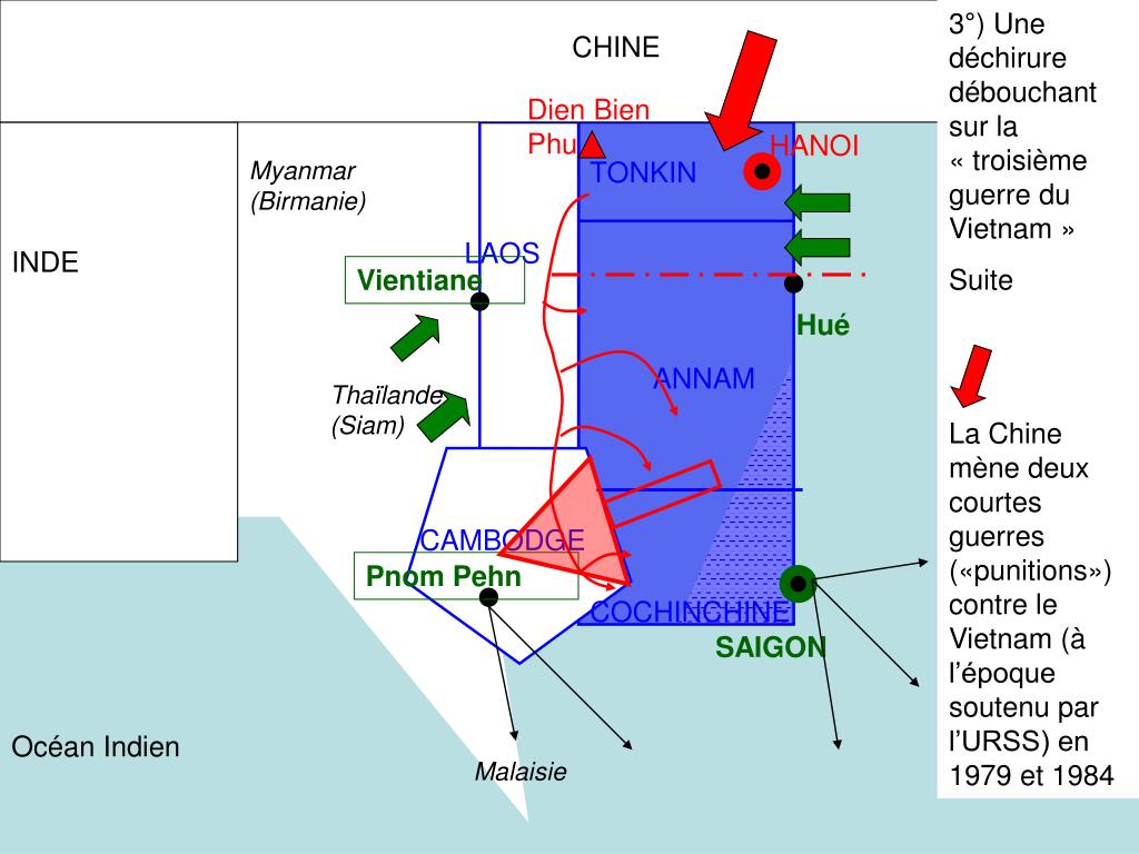 3°) Une déchirure débouchant sur la « troisième guerre du Vietnam » Suite La Chine mène deux courtes guerres («punitions») contre le Vietnam (à l’époque soutenu par l’URSS) en 1979 et 1984 CHINE Dien Bien Phu HANOI Myanmar (Birmanie) TONKIN LAOS INDE Vientiane Hué ANNAM Thaïlande (Siam) CAMBODGE Pnom Pehn COCHINCHINE SAIGON Océan Indien Malaisie