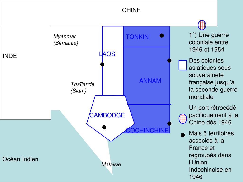 CHINE Comptoir du GuangzhouWan Myanmar (Birmanie) TONKIN LAOS INDE Mer de Chine méridionale ANNAM Thaïlande (Siam) 1°) Une guerre coloniale entre 1946 et 1954 Des colonies asiatiques sous souveraineté française jusqu’à la seconde guerre mondiale CAMBODGE COCHINCHINE Océan Indien Malaisie