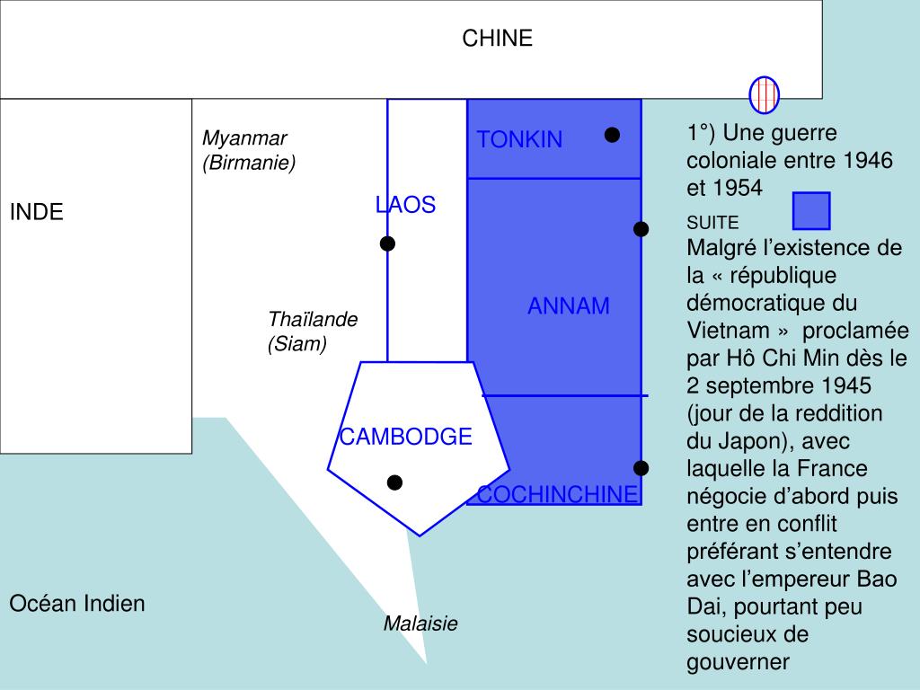 CHINE 1°) Une guerre coloniale entre 1946 et 1954 SUITE Malgré l’existence de la « république démocratique du Vietnam » proclamée par Hô Chi Min dès le 2 septembre 1945 (jour de la reddition du Japon), avec laquelle la France négocie d’abord puis entre en conflit préférant s’entendre avec l’empereur Bao Dai, pourtant peu soucieux de gouverner Myanmar (Birmanie) TONKIN LAOS INDE ANNAM Thaïlande (Siam) CAMBODGE COCHINCHINE Océan Indien Malaisie