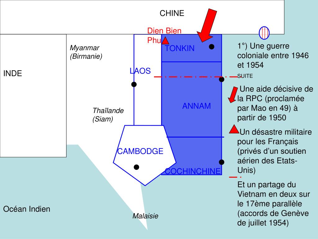 CHINE Dien Bien Phu 1°) Une guerre coloniale entre 1946 et 1954 SUITE Une aide décisive de la RPC (proclamée par Mao en 49) à partir de 1950 Un désastre militaire pour les Français (privés d’un soutien aérien des Etats-Unis) Et un partage du Vietnam en deux sur le 17ème parallèle (accords de Genève de juillet 1954) Myanmar (Birmanie) TONKIN LAOS INDE ANNAM Thaïlande (Siam) CAMBODGE COCHINCHINE Océan Indien Malaisie