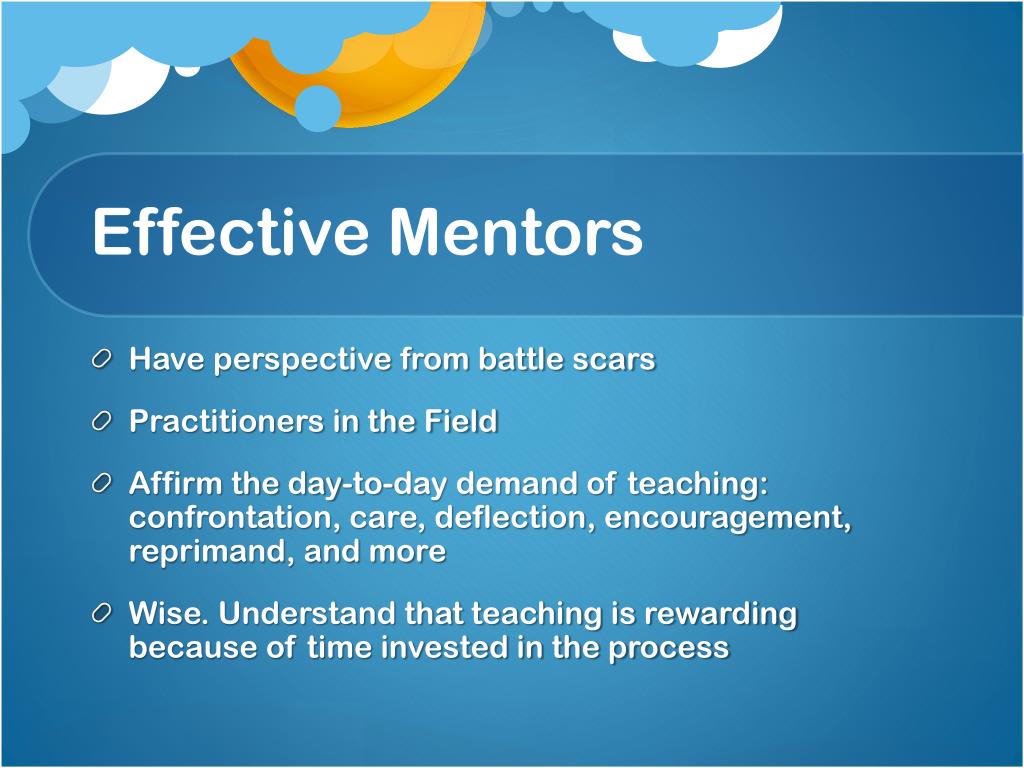 Effective Mentors • Have perspective from battle scars • Practitioners in the Field • Affirm the day-to-day demand of teaching: confrontation, care, deflection, encouragement, reprimand, and more • Wise. Understand that teaching is rewarding because of time invested in the process