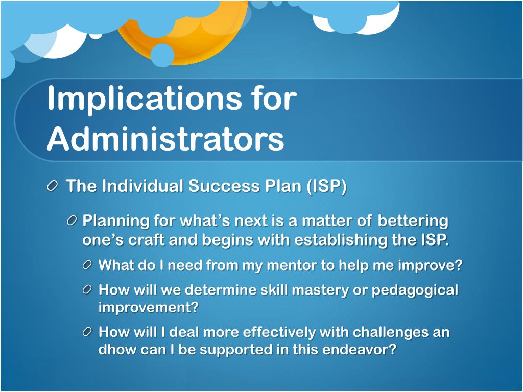 Implications for Administrators • The Individual Success Plan (ISP) • Planning for what’s next is a matter of bettering one’s craft and begins with establishing the ISP. • What do I need from my mentor to help me improve? • How will we determine skill mastery or pedagogical improvement? • How will I deal more effectively with challenges an dhow can I be supported in this endeavor?
