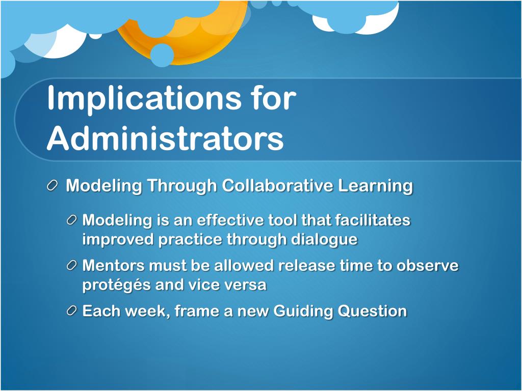 Implications for Administrators • Modeling Through Collaborative Learning • Modeling is an effective tool that facilitates improved practice through dialogue • Mentors must be allowed release time to observe protégés and vice versa • Each week, frame a new Guiding Question