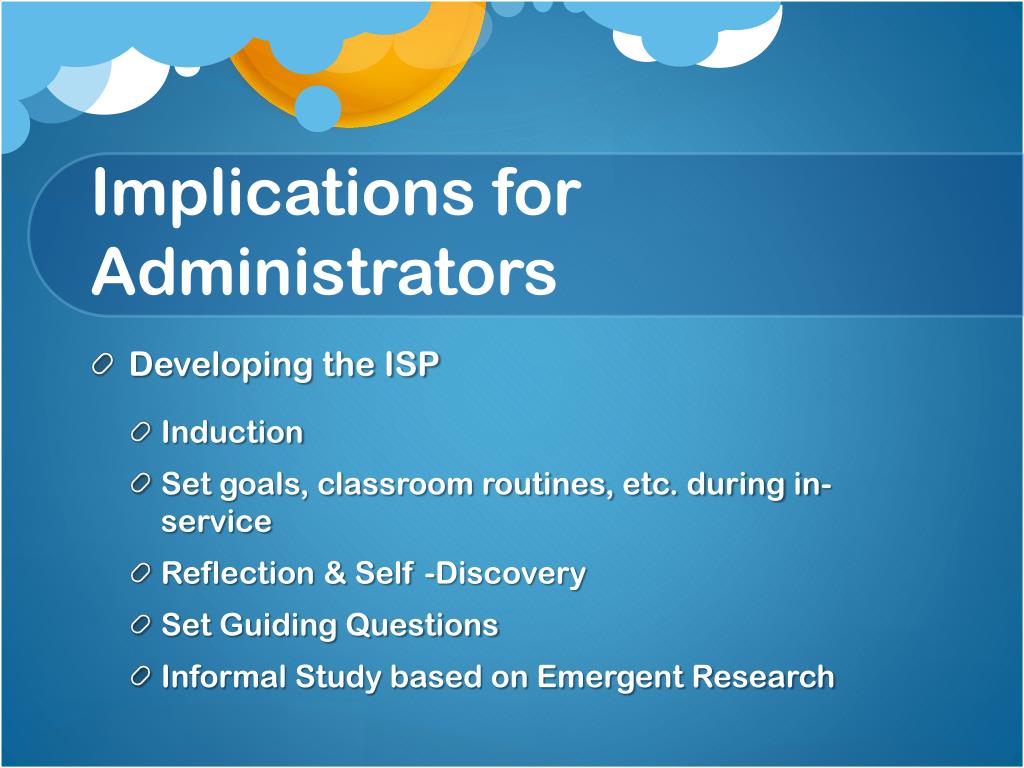 Implications for Administrators • Developing the ISP • Induction • Set goals, classroom routines, etc. during in-service • Reflection & Self -Discovery • Set Guiding Questions • Informal Study based on Emergent Research