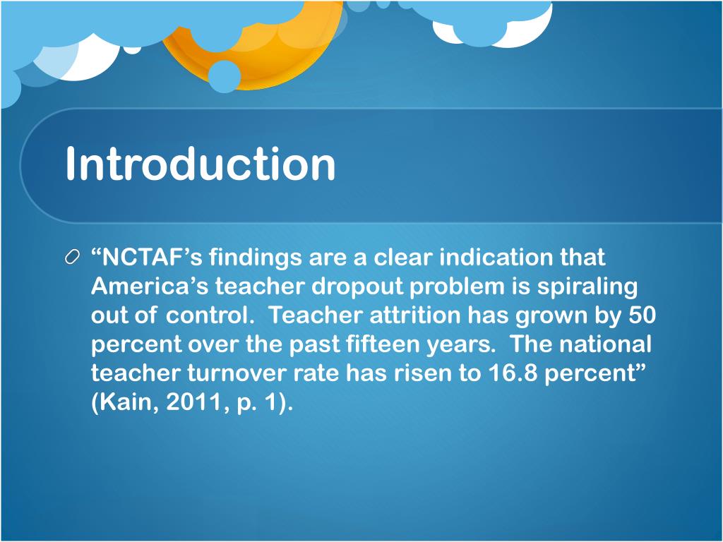 Introduction • “NCTAF’s findings are a clear indication that America’s teacher dropout problem is spiraling out of control. Teacher attrition has grown by 50 percent over the past fifteen years. The national teacher turnover rate has risen to 16.8 percent” (Kain, 2011, p. 1).