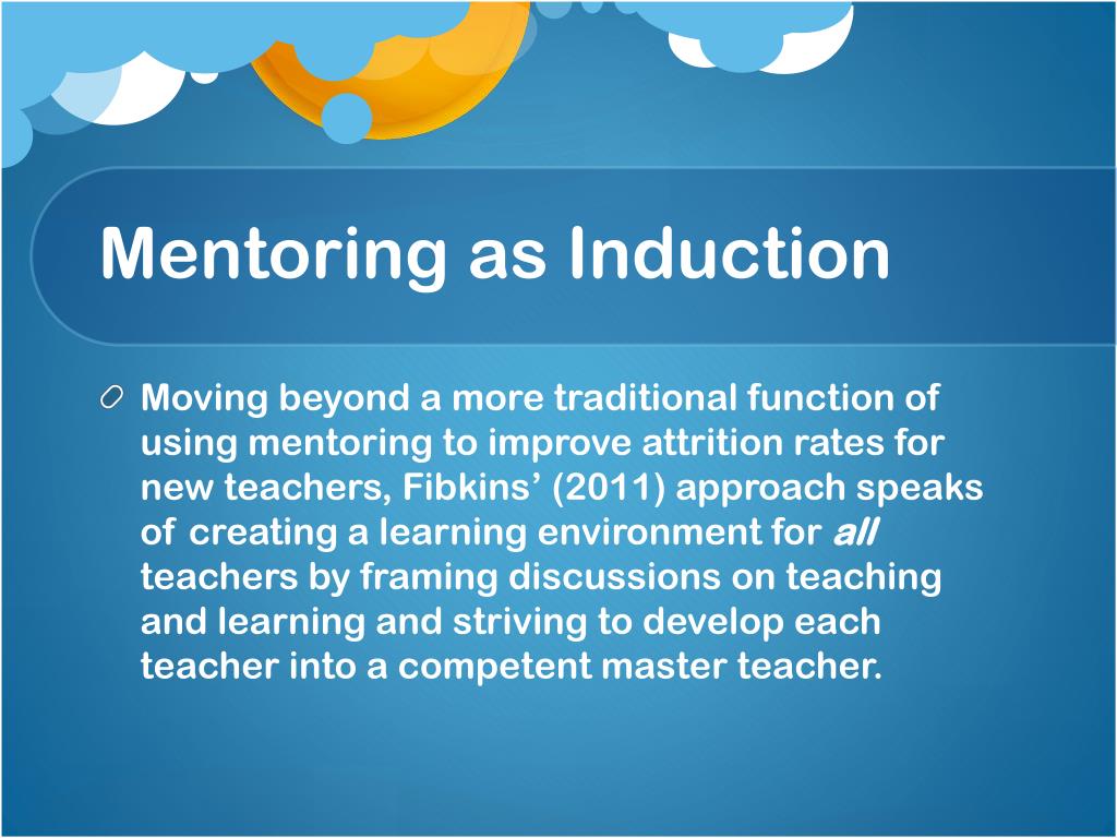 Mentoring as Induction • Moving beyond a more traditional function of using mentoring to improve attrition rates for new teachers, Fibkins’ (2011) approach speaks of creating a learning environment for all teachers by framing discussions on teaching and learning and striving to develop each teacher into a competent master teacher.