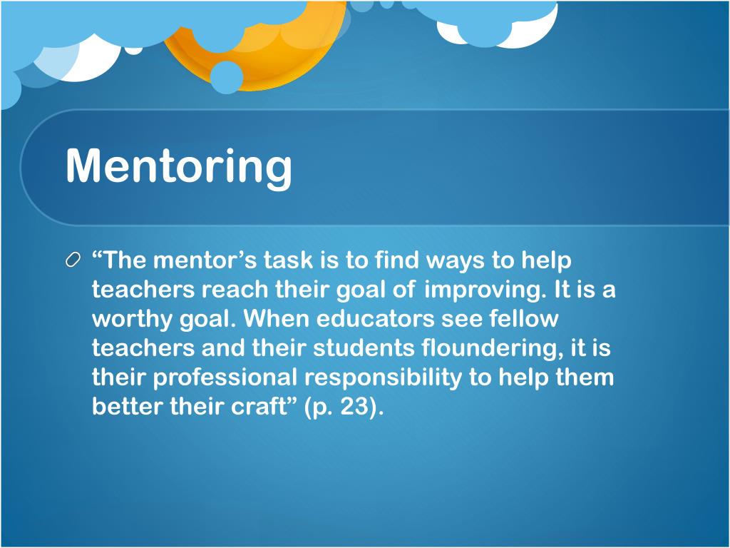 Mentoring • “The mentor’s task is to find ways to help teachers reach their goal of improving. It is a worthy goal. When educators see fellow teachers and their students floundering, it is their professional responsibility to help them better their craft” (p. 23).