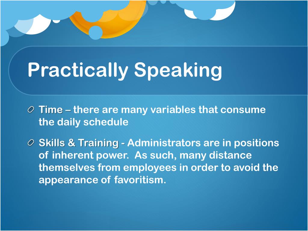 Practically Speaking • Time – there are many variables that consume the daily schedule • Skills & Training - Administrators are in positions of inherent power. As such, many distance themselves from employees in order to avoid the appearance of favoritism.