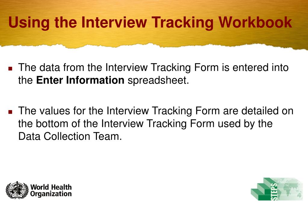 Using the Interview Tracking Workbooks. The Interview Tracking Workbook. Interview_Tracking_Form.xls is the tool used to enter the Interview Tracking Form. The workbook contains 3 different spreadsheets: Instructions Enter Information Data Entry Example.