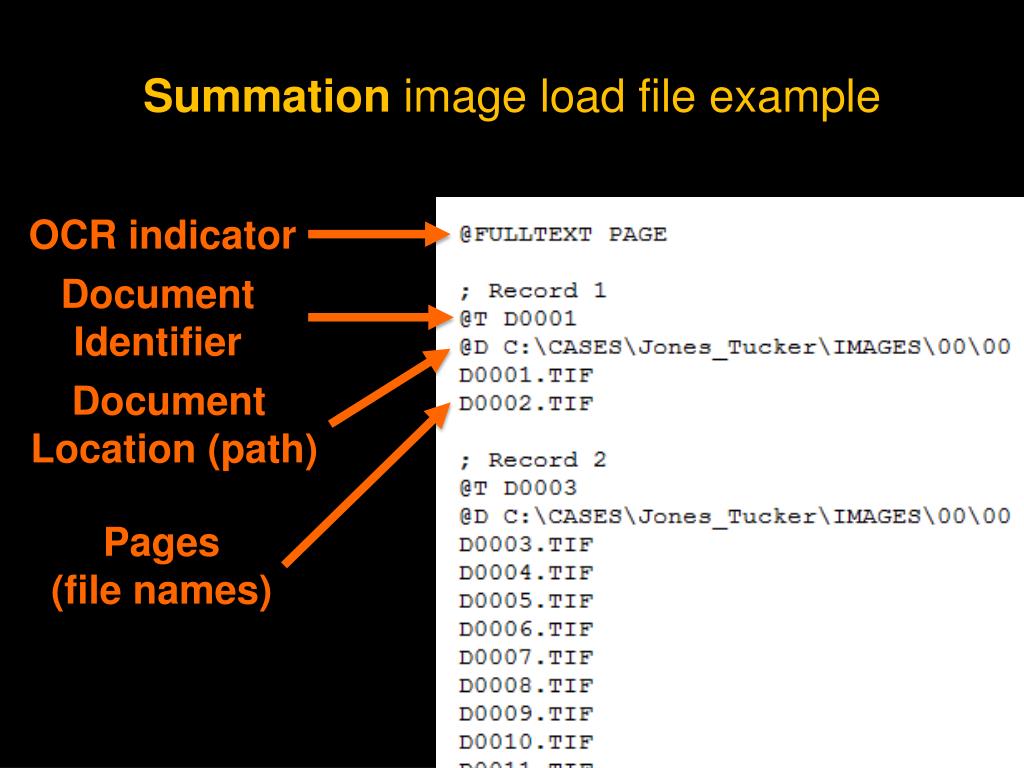 Summation image load file example OCR indicator Document Identifier Document Location (path) Pages (file names)