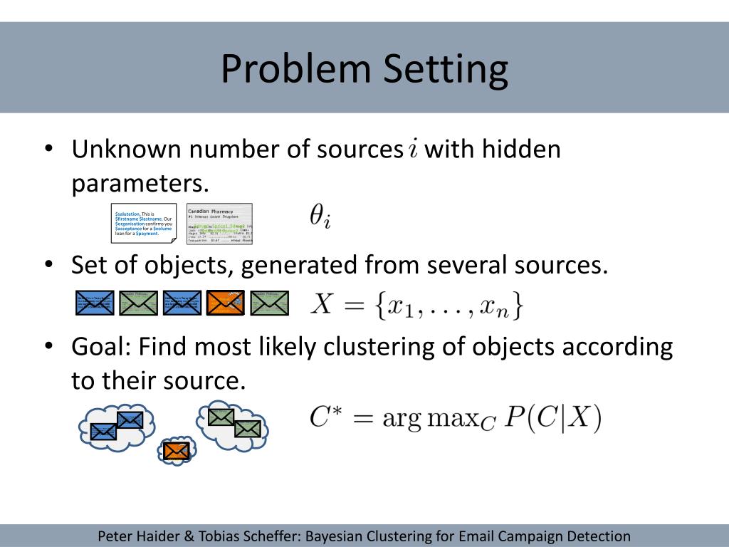 Email Campaign Detection $drug1 $price1 $drug2 $quantity $price2 . Set of objects Cluster according to their sources ? Joint likelihood: integrate out parameters $salutation, This is $firstname $lastname. Our $organisationconfirms you $acceptance for a $volumeloan for a $payment. Hello, This is Terry Hagan. Our company confirms you are legible for a $250.000 loan for a $380.00/month. Hello, This is Terry Hagan. Our company confirms you are legible for a $250.000 loan for a $380.00/month. Hello, This is Terry Hagan. Our company confirms you are legible for a $250.000 loan for a $380.00/month. Hello, This is Terry Hagan. Our company confirms you are legible for a $250.000 loan for a $380.00/month. ? Dear friend, nothing specific whatsoever. Dear friend, nothing specific whatsoever. Peter Haider & Tobias Scheffer: Bayesian Clustering for Email Campaign Detection