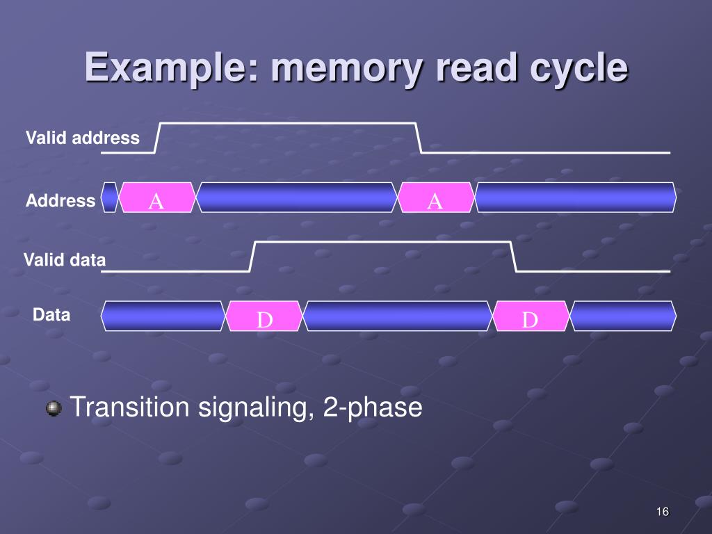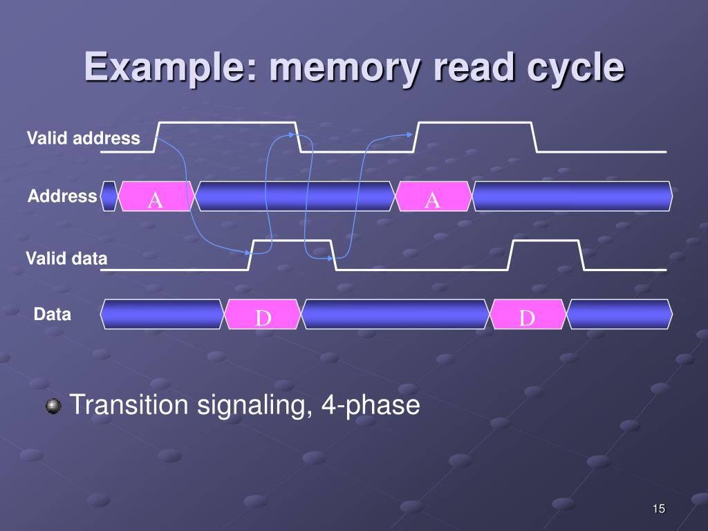 Example: memory read cycle Valid address • Transition signaling, 2-phase A A Address Valid data Data D D