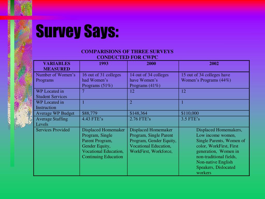 Brief Herstory of CWPC • Birth - 1975 • Purpose - to foster the development & continuance of WP in the CTC system; to share information about funding for implementation of WP on each campus • Changes - reflect the evolution of women’s programs and the women’s movement in the state; roots in the displaced homemaker network & Perkins Applied Technology ; WorkFirst, Workforce Investment Act & Rural Development • Future - Flexibility, Collaboration, Expansion