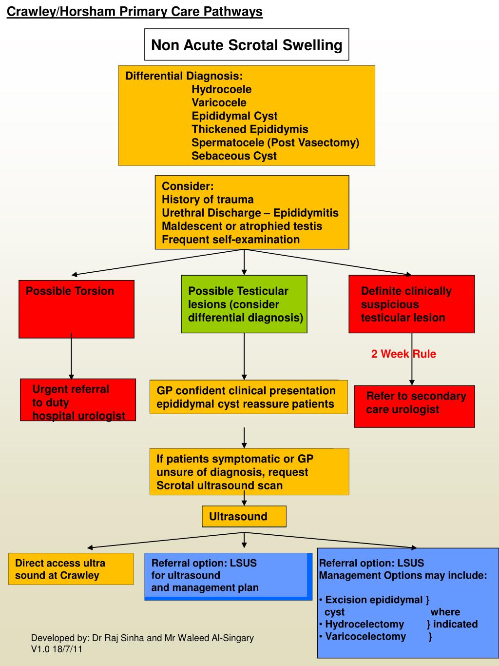 Crawley/Horsham Primary Care Pathways Non Acute Scrotal Swelling • Differential Diagnosis: • Hydrocoele • Varicocele • Epididymal Cyst • Thickened Epididymis Spermatocele (Post Vasectomy) • Sebaceous Cyst Consider: History of trauma Urethral Discharge – Epididymitis Maldescent or atrophied testis Frequent self-examination PossibleTorsion Possible Testicular lesions (consider differential diagnosis) Definite clinically suspicious testicular lesion 2 Week Rule Urgent referral to duty hospital urologist GP confident clinical presentation epididymal cyst reassure patients Refer to secondary care urologist If patients symptomatic or GP unsure of diagnosis, request Scrotal ultrasound scan Ultrasound Direct access ultra sound at Crawley Referral option: LSUS for ultrasound and management plan • Referral option: LSUS • Management Options may include: • Excision epididymal } • cyst where • Hydrocelectomy } indicated • Varicocelectomy } Developed by: Dr Raj Sinha and Mr Waleed Al-Singary V1.0 18/7/11