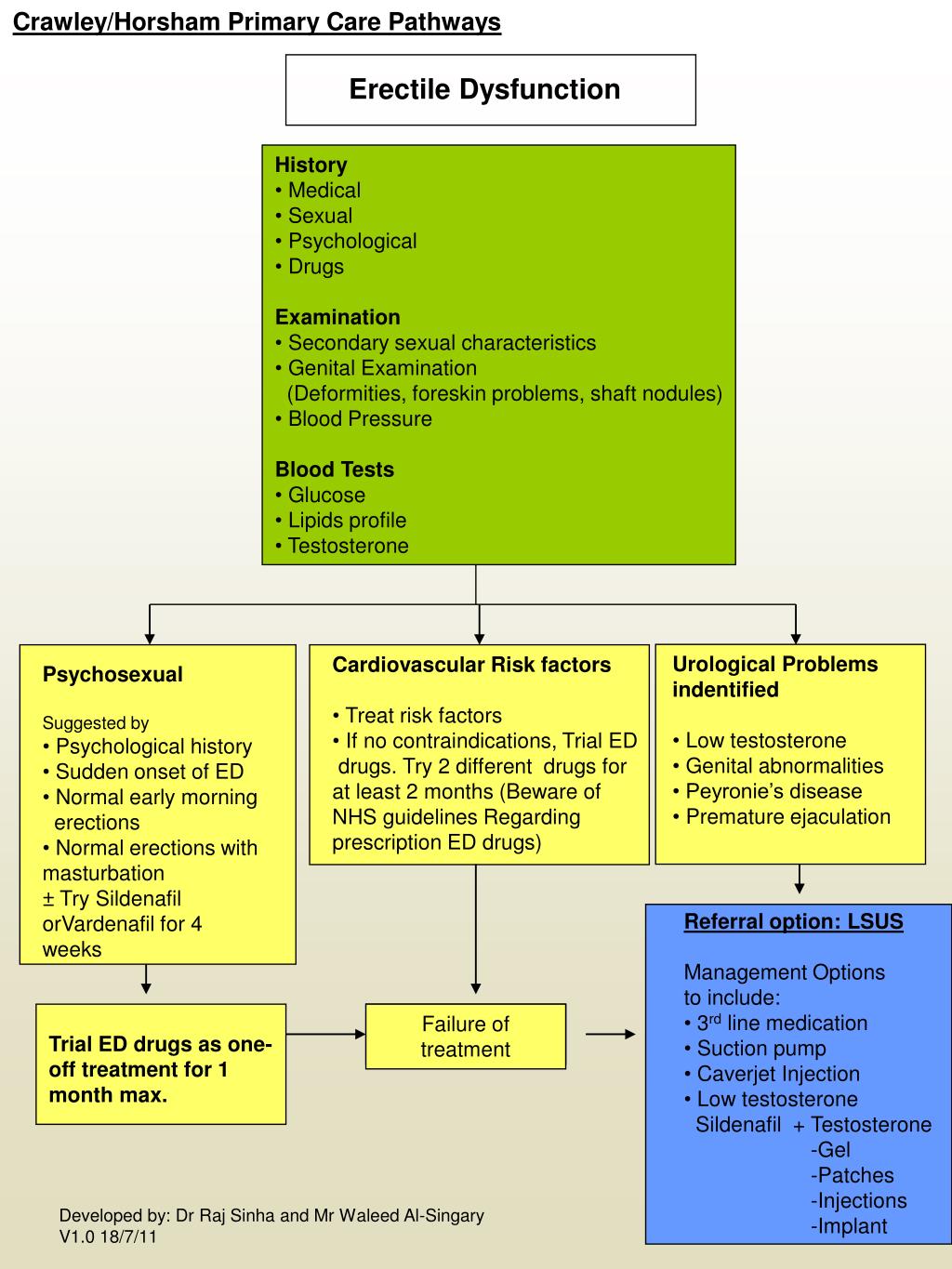 Crawley/Horsham Primary Care Pathways Erectile Dysfunction • History • Medical • Sexual • Psychological • Drugs • Examination • Secondary sexual characteristics • Genital Examination • (Deformities, foreskin problems, shaft nodules) • Blood Pressure • Blood Tests • Glucose • Lipids profile • Testosterone • Urological Problems indentified • Low testosterone • Genital abnormalities • Peyronie’s disease • Premature ejaculation • Cardiovascular Risk factors • Treat risk factors • If no contraindications, Trial ED • drugs. Try 2 different drugs for • at least 2 months (Beware of • NHS guidelines Regarding • prescription ED drugs) • Psychosexual • Suggested by • Psychological history • Sudden onset of ED • Normal early morning • erections • Normal erections with masturbation • ± Try Sildenafil orVardenafil for 4 weeks • Referral option: LSUS • Management Options • to include: • 3rd line medication • Suction pump • Caverjet Injection • Low testosterone • Sildenafil + Testosterone • Gel • Patches • Injections • Implant Failure of treatment Trial ED drugs as one-off treatment for 1 month max. Developed by: Dr Raj Sinha and Mr Waleed Al-Singary V1.0 18/7/11