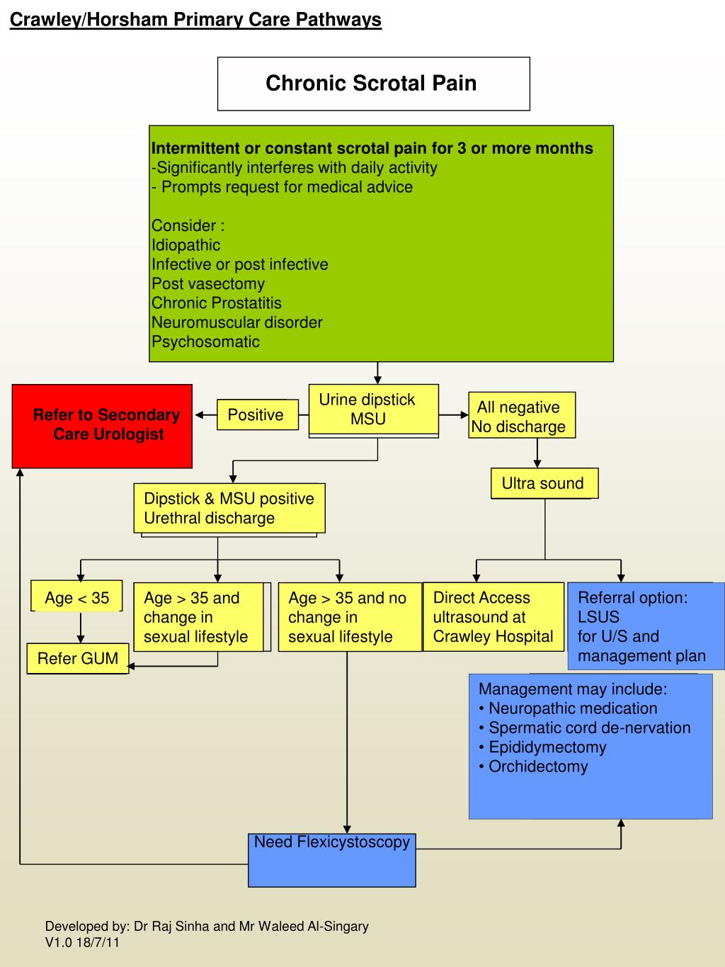 Crawley/Horsham Primary Care Pathways Chronic Scrotal Pain • Intermittent or constant scrotal pain for 3 or more months • Significantly interferes with daily activity • Prompts request for medical advice • Consider : • Idiopathic • Infective or post infective • Post vasectomy • Chronic Prostatitis • Neuromuscular disorder • Psychosomatic Urine dipstick MSU All negative No discharge Refer to Secondary Care Urologist Positive Ultra sound Dipstick & MSU positive Urethral discharge Direct Access ultrasound at Crawley Hospital Referral option: LSUS for U/S and management plan Age < 35 Age > 35 and change in sexual lifestyle Age > 35 and no change in sexual lifestyle Refer GUM • Management may include: • Neuropathic medication • Spermatic cord de-nervation • Epididymectomy • Orchidectomy Need Flexicystoscopy Developed by: Dr Raj Sinha and Mr Waleed Al-Singary V1.0 18/7/11