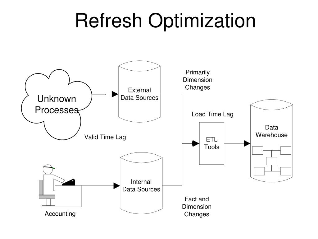 Determining the Refresh Frequency • Maximize net refresh benefit • Value of data timeliness • Cost of refresh • Satisfy data warehouse and source system constraints