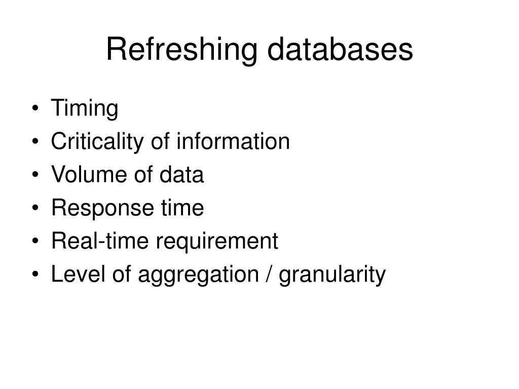 Refreshing databases • Timing • Criticality of information • Volume of data • Response time • Real-time requirement • Level of aggregation / granularity