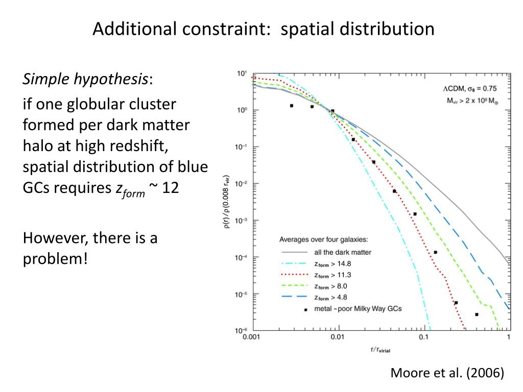 Additional constraint: spatial distribution Simple hypothesis: if one globular cluster formed per dark matter halo at high redshift, spatial distribution of blue GCs requires zform ~ 12 However, there is a problem! Moore et al. (2006)