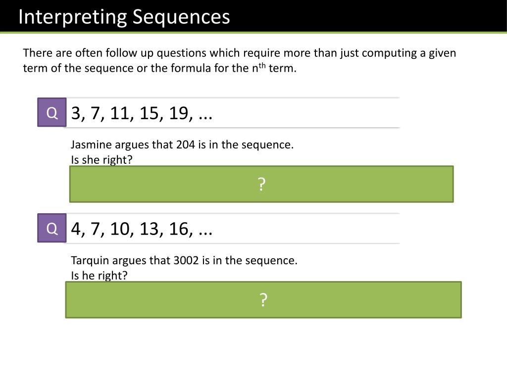 Interpreting Sequences There are often follow up questions which require more than just computing a given term of the sequence or the formula for the nth term. Q 3, 7, 11, 15, 19, ... Jasmine argues that 204 is in the sequence. Is she right? No, because 204 is an even number, and the sequence contains only odd numbers. ? Q 4, 7, 10, 13, 16, ... Tarquin argues that 3002 is in the sequence. Is he right? No, because 3002 is two more than a multiple of 3, whereas the numbers in the sequence are 1 more than a multiple of 3. ?