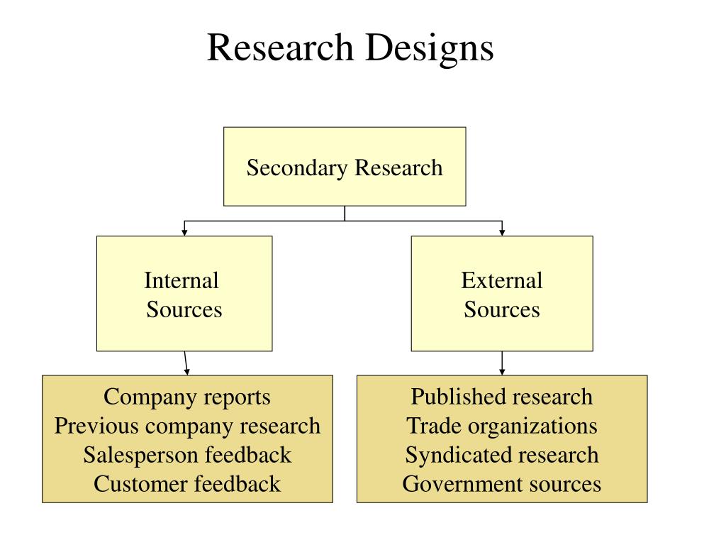 Secondary Research Internal Sources External Sources Company reports Previous company research Salesperson feedback Customer feedback Published research Trade organizations Syndicated research Government sources Research Designs