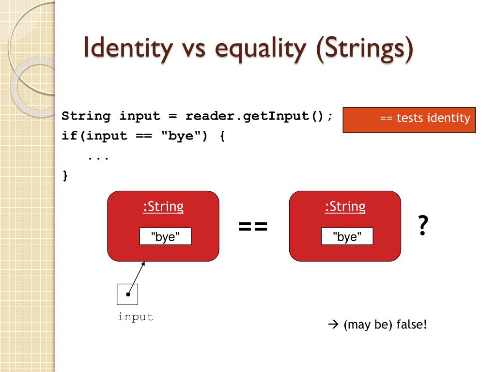 Identity vs equality (Strings) String input = reader.getInput(); if(input == "bye") { ... } == tests identity :String :String == ? "bye" "bye" input (may be) false!