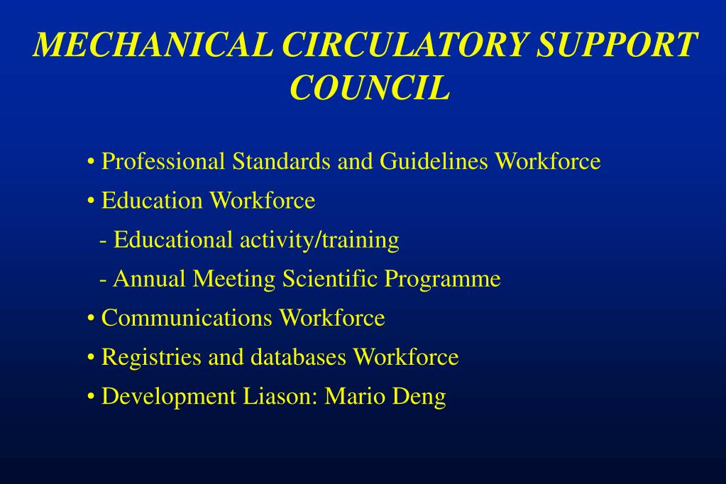 MECHANICAL CIRCULATORY SUPPORT COUNCIL • Professional Standards and Guidelines Workforce • Education Workforce • - Educational activity/training • - Annual Meeting Scientific Programme • Communications Workforce • Registries and databases Workforce • Development Liason: Mario Deng