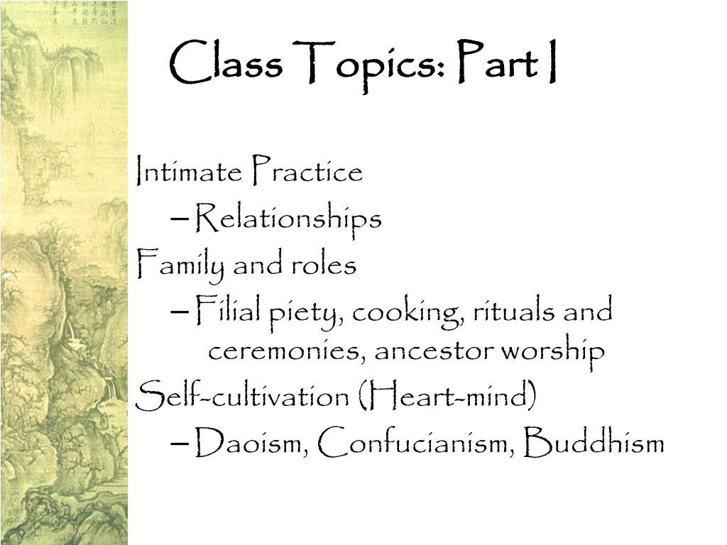 Class Topics: Part I Intimate Practice • Relationships Family and roles • Filial piety, cooking, rituals and ceremonies, ancestor worship Self-cultivation (Heart-mind) • Daoism, Confucianism, Buddhism