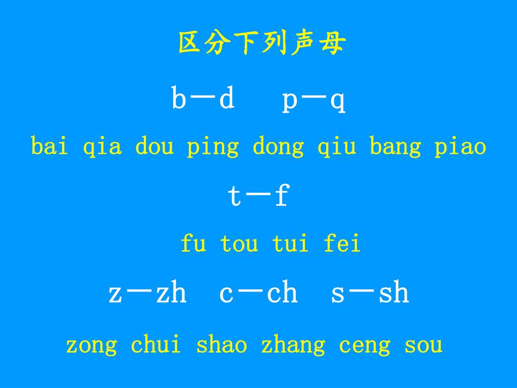 区分下列声母 b-d p-q bai qia dou ping dong qiu bang piao t-f fu tou tui fei z-zh c-ch s-sh zong chui shao zhang ceng sou