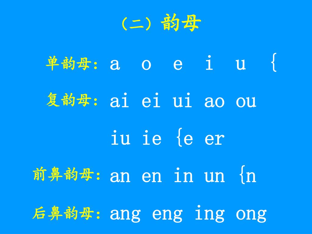 (二)韵母 a o e i u { ai ei ui ao ou iu ie {e er an en in un {n ang eng ing ong 单韵母: 复韵母: 前鼻韵母: 后鼻韵母: