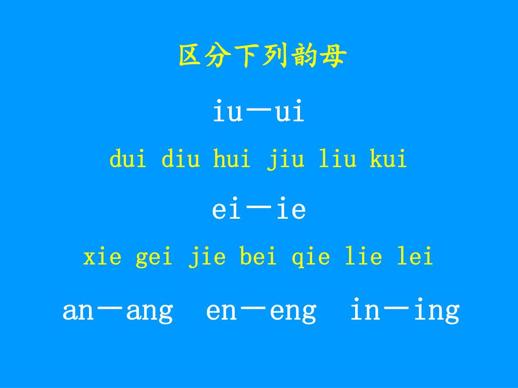 区分下列韵母 iu-ui dui diu hui jiu liu kui ei-ie xie gei jie bei qie lie lei an-ang en-eng in-ing