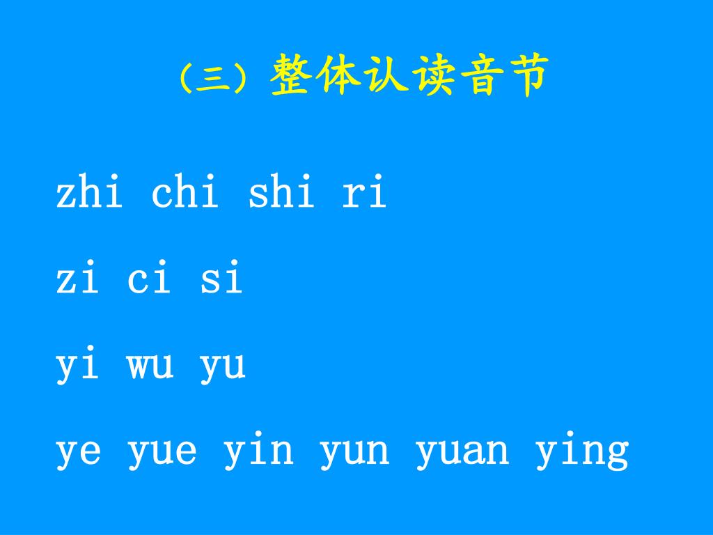 (三)整体认读音节 zhi chi shi ri zi ci si yi wu yu ye yue yin yun yuan ying